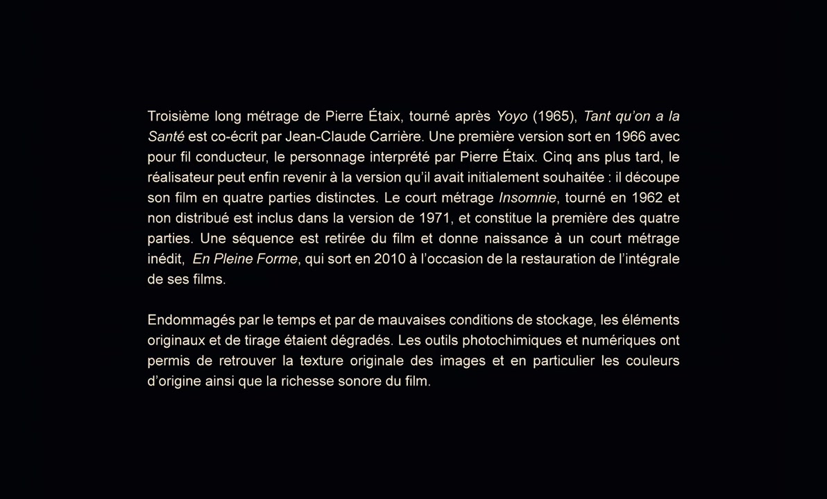 Four short comic films on the theme of mental well being in different situations are shown. In "Insomnie" (Insomnia), a man is reading a horror novel in an effort to try and fall asleep. But being engrossed in the story and what happens with his slumbering wife beside him may make falling asleep impossible, which he may not want to do if he knew what was really happening. In "Le cinématographe" (The Movies), a crowded movie theater becomes an issue for its patrons with late arrivals, differing priorities of the people in the theater, and poor theater design. In "Tant qu'on a la santé" (As Long as You've Got Your Health), the dust, vibration and noise from the jackhammering and excavation work at a construction site and the general hustle and bustle of traffic and people rushing from place to place take their toll on the general populace. The physician's booming business treating those stressed because of it has an unintended consequence at a restaurant. And in "Nous n'irons plus aux bois" (Into the Woods No More), a picnicking couple, a farmer erecting a wire fence and a small game hunter are all going about their business in the same clearing next to the woods. The activities of each negatively affects the ability of the other two to do their business.—Huggo