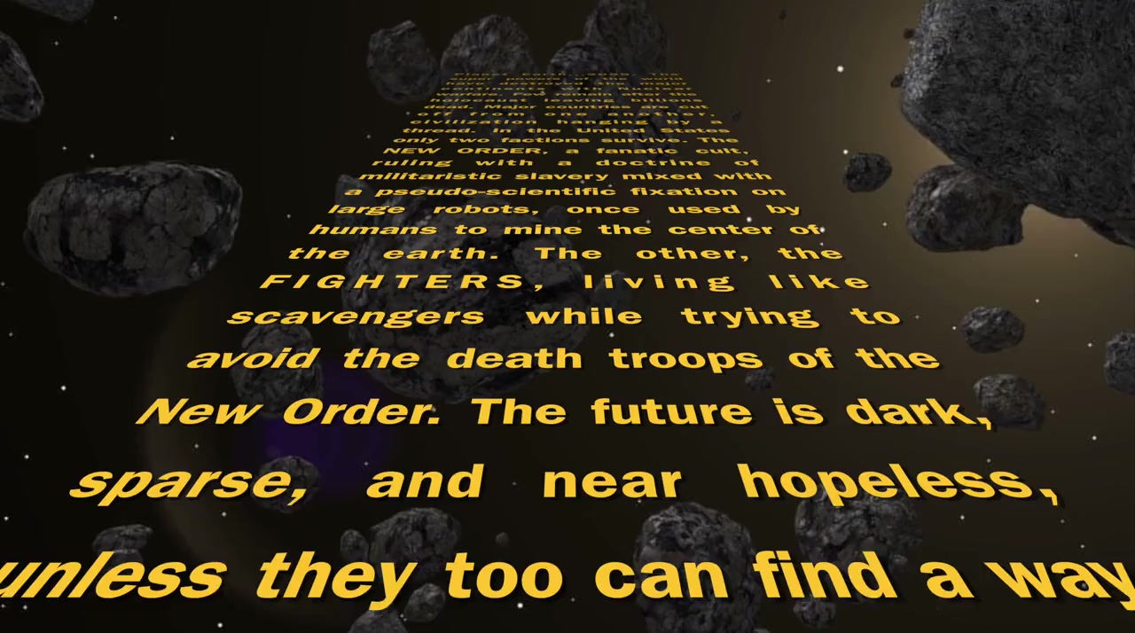 Planet Earth, 2039: The superpowers of the world have destroyed the continents with nuclear warfare. The New Order, a fanatic cult with a pseudo-scientific fixation on large robots that had been previously used to mine the center of the Earth, rule the surviving population with a doctrine of militaristic slavery. An opposition group, The Fighters, live like scavengers and avoid the New Order's death troops while plotting how to overthrow their reign of terror.—unspecified