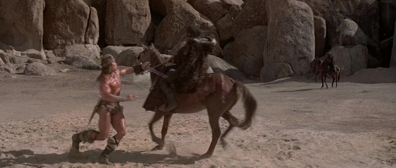 While praying at an altar with his traveling companion and fellow thief Malak (Tracey Walter), Conan (Arnold Schwarzenegger) is confronted by Queen Taramis (Sarah Douglas) of Shadazar, who tests the pair in combat with several of her guards attempting to capture him. She tells him that she has a quest for him, which he initially refuses. The queen uses her power to learn his greatest desire, to resurrect his beloved Valeria, and promises to bring her back to him, to which Conan agrees to the quest. They learn that the queen's niece, Jehnna (Olivia d'Abo) has been destined, due to a special birthmark, to find a special jewel that only she can touch and with it obtain the jewelled horn of the dreaming god, Dagoth. She tasks Conan and Malak to protect her on this journey, while her captain of the guard, Bombaata (Wilt Chamberlain), is secretly asked to betray and kill Conan once the task is complete so they can sacrifice Jehnna to the god without interruption.Due to the task of confronting a powerful wizard for the gem, Conan seeks the help of his friend, another wizard named Akiro (Mako) whom he saved from a tribe of cannibals that were about to eat him to absorb his magic power. Enroute they also meet Zula (Grace Jones), a powerful warrior and a bandit whom Jehnna and Conan save from being tortured by a group of villagers she and other bandits tried to raid, she joins the quest indebted to Conan for saving her life. They find their way to the wizard Toth-Amon's (Pat Roach) icy castle upon a lake. When they camp, however, the wizard transforms into a bird of smoke and takes Jehnna during the night. The travelers make their way into the castle and Conan is able to defeat the wizard, destroying the illusion and prompting a hasty escape from the castle. With the jewel now in hand they start to make their way to where the horn is hidden. Jehnna expresses interest in Conan, but he drunkenly rejects her for Valeria. They make their way to an ancient temple, and using the power of the jewel Jehnna is able to find and obtain the horn. Guardians of the horn attack the group and they manage to slip out a back entrance. Bombaata, having failed previously to kill Conan instead blocks their exit and takes Jehnna. After the others escape they make their way back to Shadizar and find their way inside due to a secret route Malak's "cousin's sister's brother" used previously to escape captivity. They confront Bombaata and Conan beats him in combat, killing him. Meanwhile, Jehnna is prepared to be sacrificed and the horn is placed upon the head of the Dagoth statue. Upon its first signs of life, they attempt to sacrifice Jehnna, but Zula intervenes and kills the Grand Vizier (Jeff Corey) first. Having received an improper sacrifice, the statue becomes angry and begins to twist and distort into the demonic of version Dagoth (André the Giant). Queen Taramis is killed and Conan battles the Dagoth, eventually killing it by removing the horn from its head.After the battle, the newly crowned queen Jehnna offers each of her companions a place in her new court. Zula becomes the new captain of the guard, because Jehnna does not see any reason why a woman can't do as good a job as any man. Akiro becomes her new wiseman and advisor, and Malak steps forward and nearly trips, qualifying him for the position of court fool. She offers Conan her hand and the opportunity to rule the kingdom together, which he declines; having been promised a kingdom already, and departs on his own for further adventures and to find his own place in the world.