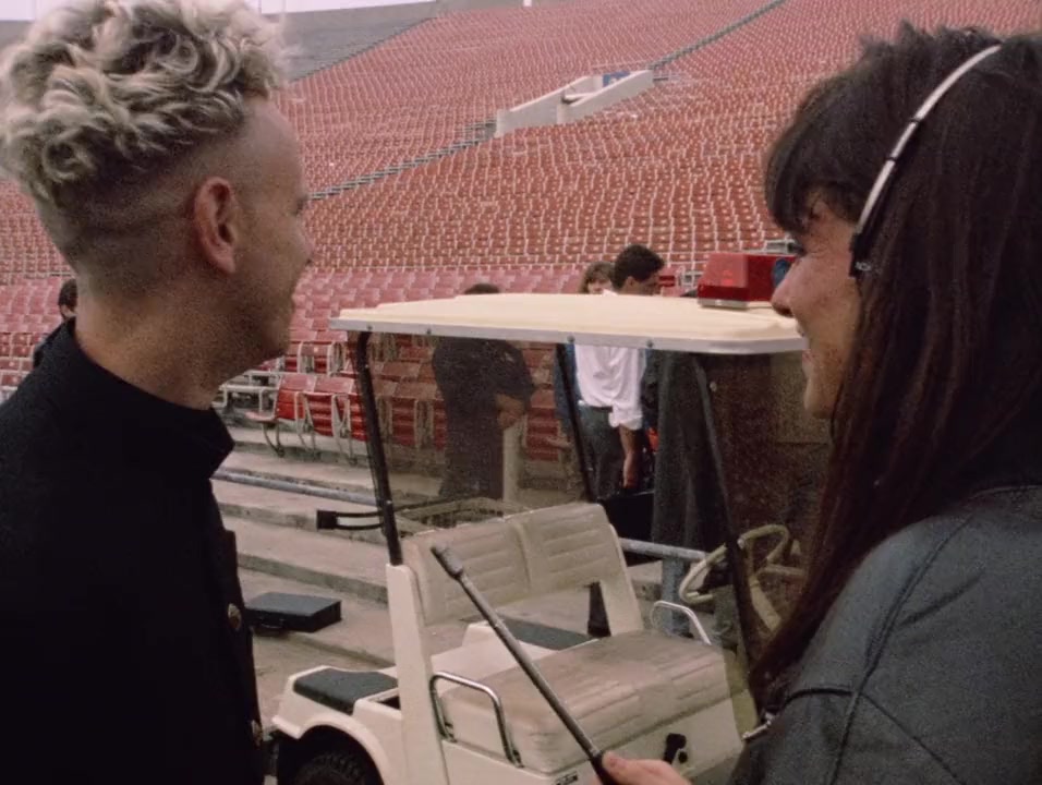 Depeche Mode prepares for the 101st and final concert of its massive world tour at the Rose Bowl Stadium, Pasadena, California, while a group of fans who won a contest travel to the concert through the United States on a bus.
