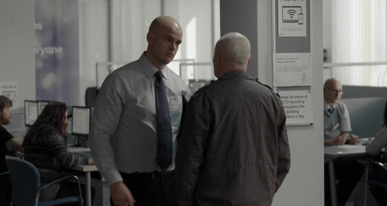 Newcastle upon Tyne, England. On the very far side of middle age, widowed Daniel Blake, a construction worker specializing in fine carpentry work, is recuperating from a heart attack. Despite his GP and cardiologist's assessment that he is not yet fit enough to return to work, he is denied employment and support allowance based on the standardized criteria assessment by the government agency. With no savings and no personal support, he is relying on some sort of government financial assistance to help him through this time when he should not be working. As he tries to set in motion the appeals process for the employment and support allowance and as he tries to find any other government program for which he may even be remotely eligible to tie him through the short term until he is deemed healthy enough to return to work, he runs into one bureaucratic quagmire after another, each process seemingly designed to make people like him fail and give up. Through this time, he is enmeshed within the lives of two sets of people. The first is his young neighbor, China, and China's friend, Piper, who are trying to start a new business in today's global economy. The second is Katie Morgan, a single mother to adolescents Daisy and Dylan Morgan. The Morgans have just moved to Newcastle from London solely as that is where there was social housing available. Katie too has fallen into the bureaucratic runaround at social services. Regardless, Katie is determined to make a home for her two children despite her financial problems. Regardless of his own health and financial issues, the former which he doesn't tell Katie, Daniel is equally determined that Katie will not end up in the same situation as him, he doing whatever he can to help her.—Huggo