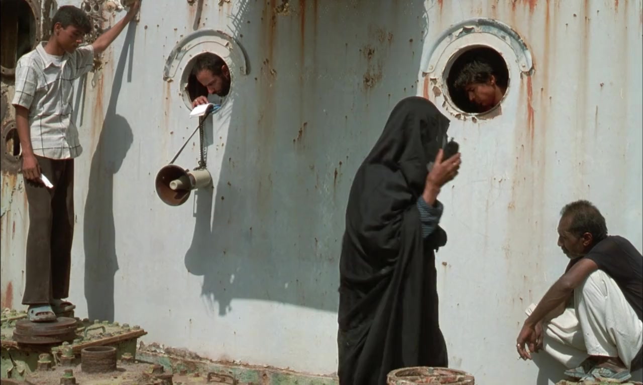Squatters, mostly Arabs in Persia, live on a mothballed oil tanker in the Persian Gulf. The children attend a school on board; men harvest scrap metal and old oil in the hull; women keep house and raise children. Captain Nemat runs things with an iron hand, orienting new residents, keeping the books, negotiating with new buyers who may want to scrap the ship, arranging things, keeping discipline. We follow a lad who rescues fish trapped in the hull, an old man who stares at the sun, the idealistic teacher, and Ahmad, the Captain's assistant who has fallen in love with a young woman whose father wants to marry her to someone of means. What future has this sinking city?—