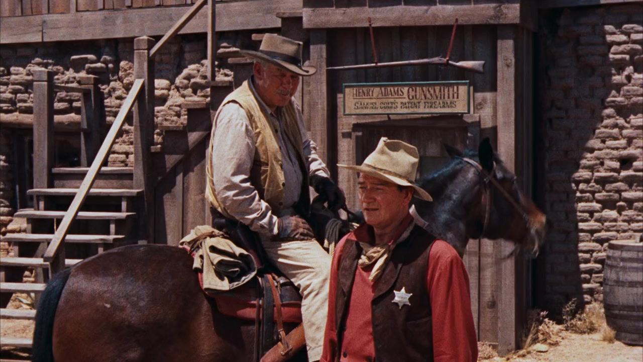 The town drunk - former deputy sheriff, Dude, (Dean Martin) enters a saloon through the back door. He's dirty, unshaven and broke. A man called Joe Burdette (Claude Akins), the brother of the wealthy, corrupt local rancher Nathan, (John Russell) stands at the bar smiling as he watches how desperate Dude looks for a drink. He tosses a coin into the spittoon and laughs. Dude reluctantly bends down to pick it up but his old friend sheriff John T.Chance (John Wayne) kicks it out of the way. Burdette smiles and Chance starts to approach him. Dude feeling shamed picks up a piece of wood and knocks Chance out with it. Joe still smiles. Dude goes to hit him but Joe's men grab him and beat him. As Joe starts on him, an unarmed customer grabs his arm to stop him and Joe pulls out his gun and shoots him dead. He strolls out of the saloon leaving Chance and Dude half unconscious near the dead body.Joe walks into another of the town's bars and Chance walks in, head bleeding, dazed and pointing his rifle at him to arrest him. He tells him he's under arrest. Because of Joe's connections, there's some men to back him up in this saloon as well. A man stands behind Chance and pulls his gun on him. Dude appears at the salon doors and whips out someone else's gun and shoots the other gunman's hand to protect Chance. Joe goes for his gun and Chance knocks him out with his rifle. Dude helps Chance take him over to jail.The next day, as the funeral of Joe's victim takes place, a wagon train arrives in town led by Pat Wheeler (Ward Bond) and his youthful gunslinging helper, Colorado (Ricky Nelson). Pat and Chance are old friends and Chance tells him about the trouble going on in town. Burdette has his men scattered all over and he only has his reinstated deputy dude and old, crippled Stumpy (Walter Brennan) for support. There's no way he can get Joe out of town to the marshal, - he's going to have to wait a few days for the marshal and his posse to arrive to pick him up. Pat goes off to leave the wagons which are filled with oil and dynamite near Nathan's warehouse, while Chance and Dude join Stumpy inside for a drink of beer. Just as Dude is about to take a drink near the cell, Joe starts to taunt him again about his shaking and trying to dry out. Dude throws the glass bottle at the bars in anger. A package arrives for the hotel owner Carlos (Pedro Gonzalez) and Chance takes it over for him.It's some underwear for his wife Consuela. As Chance and Carlos are talking, a woman appears at the door,"Feathers" (Angie Dickinson). Just arrived in town, she laughs at the sight of the sheriff and Carlos with the underwear.Chance walks out.Later at night, Chance,Dude and Stumpy are sat at the office. Chance and Stumpy see that Dude is restless and suffering with the drying out process.Realising he needs a distraction, Chance tells Stumpy that he and Dude are going to patrol the town. As they wander the street, Carlos comes out of the hotel and tells Chance that Pat has been spreading the word around that the sheriff needs some help. Chance goes inside and interrupts the card game that Pat's having with Colorado, Feathers and a few others. The two of them have a talk at the bar. Chance warns him that anybody who goes around publicly asking for people to help him out could end up dead. Pat offers to help him but Chance tells him no. He'd be no good if he needs Colorado for protection. So Pat offers him Colorado's help. As he goes to get him, Chance inspects a deck of cards that Pat and the others were playing with. Pat brings Colorado over but the young man says he's not interested. He's just going to mind his own business. Pat tells Chance that he's leaving in the morning. Chance gets ready to leave and notices Feathers winning another hand. He follows her up to her room to have a word with her. He tells her that the cards he looked at had three aces missing. He pulls out a wanted bill for a con-man and he's identified her as the man's partner. She admits she is but says she hasn't cheated. She says he's going to have to search her. As Chance starts to feel uncomfortable, Colorado appears and tells him he thinks it's the man with the checkered vest who's been cheating. They approach him downstairs and he tries to go for his gun but Colorado's faster. He whips his gun out and after searching him, he finds the cards. Chance tells Carlos to lock the man in his room all night and to make sure he leaves town in the morning. He tells the others to split his winnings between them and thanks Colorado. Colorado asks him about Feathers but Chance is reluctant to apologise to her. He just tells her he was wrong. He leaves the hotel and asks Dude where Pat is. Pat's walking down the street towards them but he is shot by a man hiding in the stable. Chance and Dude run to him but he's dead. Colorado asks Chance if he can help them pursue the gunman but Chance says no. Chance bursts into the barn but the gunman gets away to the saloon. Dude gets a few shots of and thinks he might have got him. Chance lets Dude go in the front entrance of the saloon while he goes through the back. The customers tell them that no one has entered. Dude looks for a man with muddy boots as the gunman watches from the balcony. None of the men have muddy boots. He even checks the barman's to make sure. The men start laughing at him.One of them tosses a coin into the spitoon. Dude looks shameful and Chance looks doubtful about his mind but Dude notices some blood dripping into a glass of beer on the bar. Dude knows he's there. He turns around, whips out his gun and shoots up at him. The dead body lands in front of the bar. Dude finds a 50 dollar goldpiece on him and know it's the work of Burdette offering money to hitmen. Chance confronts the man who told them no one came in and hits him over the head with his rifle. He tells the barman to collect the mens guns and take them over to the jail. Chance tells Dude that he'll let him go in the front often.Colorado a