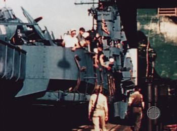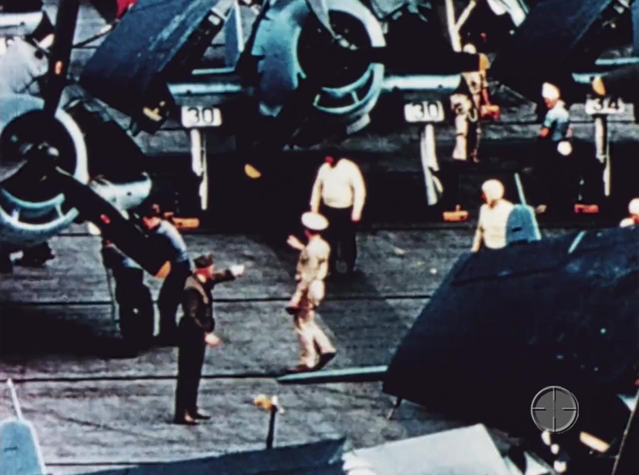 The film follows the WWII exploits of the Essex-class aircraft carrier USS Yorktown (CV-10) (unidentified in the film), in its first major operations following its commissioning in 1943. The life of the crew is documented from July 1943 to June 1944, from its passage through the Panama Canal through assaults on Marcus, Kwajalein, Truk and Tinian Islands, and culminating with the Battle of the Philippine Sea. Spectacular 16mm Kodachrome footage of combat operations and naval aviation is prominent throughout.—scgary66