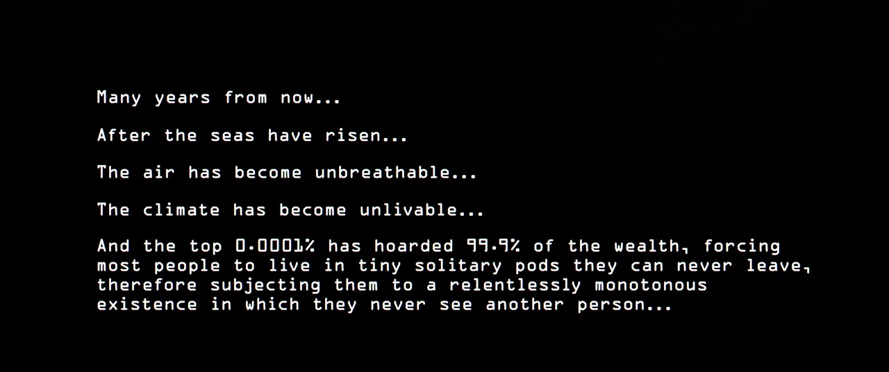 In the distant future where the outside climate is unlivable and everyone is forced to spend their lives alone in tiny rooms, two people win the rare opportunity to go on a very unusual date - in person.